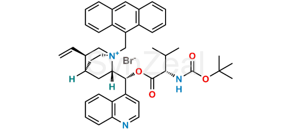 Cinchonidine Impurity 2 is chemically (1S,2S,4S,5R)-1-(Anthracen-9-ylmethyl)-2-((R)-(((tert-butoxycarbonyl)-L-valyl)oxy)(quinolin-4-yl)methyl)-5-vinylquinuclidin-1-ium bromide. Cinchonidine Impurity 2 is supplied with detailed characterization data compliant with regulatory guideline. Cinchonidine Impurity 2 can be used for the analytical method development, method validation (AMV), Quality Controlled (QC) application for Abbreviated New Drug Application (ANDA) or during commercial production of Cinchonidine.