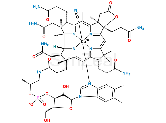 Cyanocobalamin EP Impurity A is chemically Coα-[α-(5,6-dimethylbenzimidazolyl)]-Coβ-cyano-8β-hydroxycobamic a,b,d,e,g-pentaamidec,8-γ-lactone (as per EP). It is also known as Cyanocobalamin c,8-lactone, cyanocobalamin 7β,8β-lactone (EP). Cyanocobalamin EP Impurity A is supplied with detailed characterization data compliant with regulatory guideline. Cyanocobalamin EP Impurity A can be used for the analytical method development, method validation (AMV), Quality Controlled (QC) application for Abbreviated New Drug Application (ANDA) or during commercial production of Cyanocobalamin.