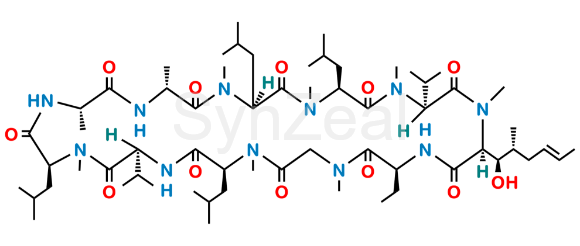 Nome Químico: 1,11-Anhydro[L-alanyl-d-alanyl-N-methyl-L-leucyl-N-methyl-L-leucyl-N-methyl-L-valyl-(2S,3R,4R,6E)-3-hydroxy-4-methyl-2-(methylamino)oct-6-enoyl-(2S)-2-aminobutanoyl-N-methylglycyl-N-methyl-L-leucyl-L-valyl-N-methyl-L-leucine] (as per EP) ; Cyclo[[(E)-(2S,3R,4R)-3-hydroxy-4-methyl-2-(methylamino)oct-6-enoyl]-l-2-aminobutyryl-N-methylglycyl-N-methyl-l-leucyl-l-valyl-N-methyl-l-leucyl-l-alanyl-d-alanyl-N-methyl-l-leucyl-N-methyl-l-leucyl-N-methyl-l-valyl] (as per USP)
