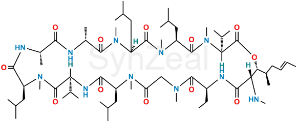 Nome Químico: O3.1,11-anhydro[(2S,3R,4R,6E)-3-hydroxy-4-methyl-2-(methylamino)oct-6-enoyl-(2S)-2-aminobutanoyl-N-methylglycyl-N-methyl-l-leucyl-l-valyl-N-methyl-l-leucyl-l-alanyl-d-alanyl-N-methyl-l-leucyl-N-methyl-l-leucyl-N-methyl-l-valine] (as per EP) ; L-Valine, (2S,3R,4R,6E)-3-hydroxy-4-methyl-2-(methylamino)-6-octenoyl-(2S)-2-aminobutanoyl-N-methylglycyl-N-methylL-leucyl-L-valyl-N-methyl-L-leucyl-L-alanyl-D-alanyl-N-methyl-L-leucyl-N-methyl-L-leucyl-N-methyl-, (11→1)-lactone (as per USP)