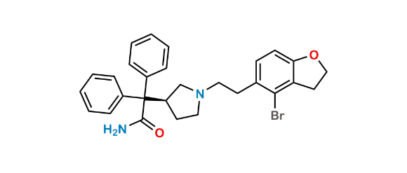 Darifenacin Bromo Impurity 2 is chemically (S)-2-(1-(2-(4-Bromo-2,3-dihydrobenzofuran-5-yl)ethyl)pyrrolidin-3-yl)-2,2-diphenylacetamide. Darifenacin Bromo Impurity 2 is supplied with detailed characterization data compliant with regulatory guideline. Darifenacin Bromo Impurity 2 can be used for the analytical method development, method validation (AMV), Quality Controlled (QC) application for Abbreviated New Drug Application (ANDA) or during commercial production of Darifenacin.
