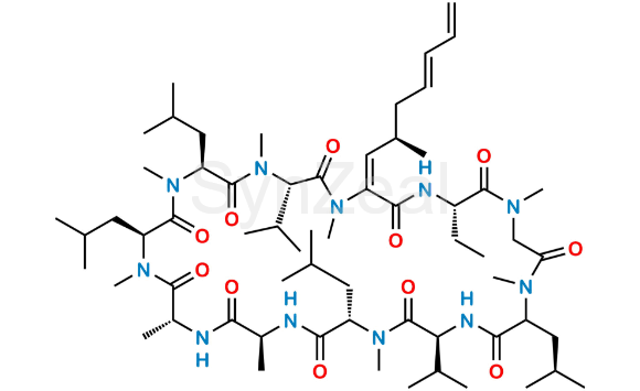 Dehydro Cyclosporin is chemically (3S,6S,9S,12R,15S,18S,21S,30S,E)-30-ethyl-6,9,18,24-tetraisobutyl-3,21-diisopropyl-1,4,7,10,12,15,19,25,28-nonamethyl-33-((R,E)-2-methylhepta-4,6-dien-1-ylidene)-1,4,7,10,13,16,19,22,25,28,31-undecaazacyclotritriacontan-2,5,8,11,14,17,20,23,26,29,32-undecaone. Dehydro Cyclosporin is supplied with detailed characterization data compliant with regulatory guideline. Dehydro Cyclosporin can be used for the analytical method development, method validation (AMV), Quality Controlled (QC) application for Abbreviated New Drug Application (ANDA) or during commercial production of Cyclosporin.