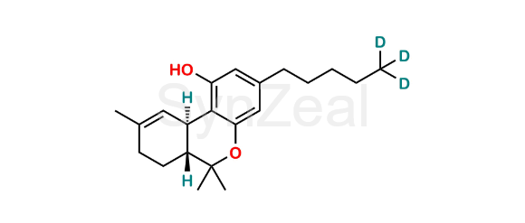 Delta-9-Tetrahydrocannabinol D3 is chemically (6aR,10aR)-6,6,9-trimethyl-3-(pentyl-5,5,5-d3)-6a,7,8,10a-tetrahydro-6H-benzo[c]chromen-1-ol. Delta-9-Tetrahydrocannabinol D3 is supplied with detailed characterization data compliant with regulatory guideline. Delta-9-Tetrahydrocannabinol D3 can be used for the analytical method development, method validation (AMV), Quality Controlled (QC) application for Abbreviated New Drug Application (ANDA) or during commercial production of Cannabidiol.