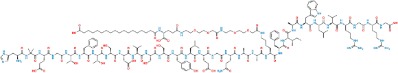 Des-Glu21 Semaglutide is chemically (3S,9S,12S,15S,18S,21S,24S,27S,30S,33S,36S,39S,45S,48S,51S,54S,81R)-54-(((6S,12S,15S,18S,21S,24S,27S,30S)-21-((1H-indol-3-yl)methyl)-1-amino-27-((S)-sec-butyl)-6-((carboxymethyl)carbamoyl)-12-(3-guanidinopropyl)-1-imino-18-isobutyl-15-isopropyl-24-methyl-8,11,14,17,20,23,26,29-octaoxo-31-phenyl-2,7,10,13,16,19,22,25,28-nonaazahentriacontan-30-yl)carbamoyl)-3-(2-((S)-2-amino-3-(1H-imidazol-5-yl)propanamido)-2-methylpropanamido)-45-(3-amino-3-oxopropyl)-12-benzyl-39-(2-carboxyethyl)-21-(carboxymethyl)-33-(4-hydroxybenzyl)-9,15-bis((R)-1-hydroxyethyl)-18,27,30-tris(hydroxymethyl)-36-isobutyl-24-isopropyl-48,51-dimethyl-4,7,10,13,16,19,22,25,28,31,34,37,40,43,46,49,52,60,69,78,83-henicosaoxo-62,65,71,74-tetraoxa-5,8,11,14,17,20,23,26,29,32,35,38,41,44,47,50,53,59,68,77,82-henicosaazanonanonacontane-1,81,99-tricarboxylic acid. Des-Glu21 Semaglutide is supplied with detailed characterization data compliant with regulatory guideline. Des-Glu21 Semaglutide can be used for the analytical method development, method validation (AMV), Quality Controlled (QC) application for Abbreviated New Drug Application (ANDA) or during commercial production of Semaglutide.