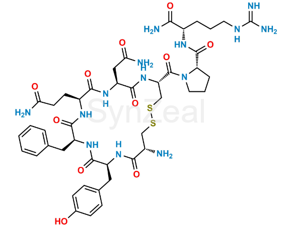 Des-Gly-Vasopressin is chemically (S)-N-((S)-1-Amino-5-guanidino-1-oxopentan-2-yl)-1-((4R,7S,10S,13S,16S,19R)-19-amino-7-(2-amino-2-oxoethyl)-10-(3-amino-3-oxopropyl)-13-benzyl-16-(4-hydroxybenzyl)-6,9,12,15,18-pentaoxo-1,2-dithia-5,8,11,14,17-pentaazacycloicosane-4-carbonyl)pyrrolidine-2-carboxamide. Des-Gly-Vasopressin is supplied with detailed characterization data compliant with regulatory guideline. Des-Gly-Vasopressin can be used for the analytical method development, method validation (AMV), Quality Controlled (QC) application for Abbreviated New Drug Application (ANDA) or during commercial production of Vasopressin.