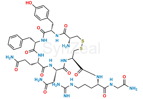 Des-Pro-Vasopressin is chemically (4R,7S,10S,13S,16S,19R)-19-amino-7-(2-amino-2-oxoethyl)-N-((S)-1-((2-amino-2-oxoethyl)amino)-5-guanidino-1-oxopentan-2-yl)-10-(3-amino-3-oxopropyl)-13-benzyl-16-(4-hydroxybenzyl)-6,9,12,15,18-pentaoxo-1,2-dithia-5,8,11,14,17-pentaazacycloicosane-4-carboxamide. Des-Pro-Vasopressin is supplied with detailed characterization data compliant with regulatory guideline. Des-Pro-Vasopressin can be used for the analytical method development, method validation (AMV), Quality Controlled (QC) application for Abbreviated New Drug Application (ANDA) or during commercial production of Vasopressin.
