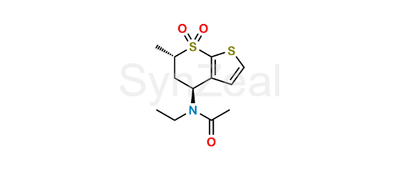 Desaminosulfonyl N-Acetyl-Dorzolamide is chemically N-Ethyl-N-((4S,6S)-6-methyl-7,7-dioxido-5,6-dihydro-4H-thieno[2,3-b]thiopyran-4-yl)acetamide. Desaminosulfonyl N-Acetyl-Dorzolamide is supplied with detailed characterization data compliant with regulatory guideline. Desaminosulfonyl N-Acetyl-Dorzolamide can be used for the analytical method development, method validation (AMV), Quality Controlled (QC) application for Abbreviated New Drug Application (ANDA) or during commercial production of Dorzolamide.