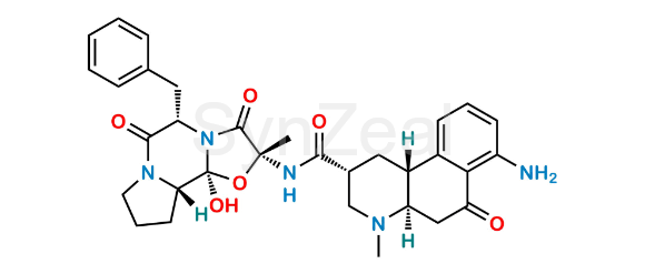 Dihydroergotamine Mesylate Impurity 1 is chemically (2R,4aR,10bR)-7-Amino-N-((2R,5S,10aS,10bS)-5-benzyl-10b-hydroxy-2-methyl-3,6-dioxooctahydro-8H-oxazolo[3,2-a]pyrrolo[2,1-c]pyrazin-2-yl)-4-methyl-6-oxo-1,2,3,4,4a,5,6,10b-octahydrobenzo[f]quinoline-2-carboxamide. Dihydroergotamine Mesylate Impurity 1 is supplied with detailed characterization data compliant with regulatory guideline. Dihydroergotamine Mesylate Impurity 1 can be used for the analytical method development, method validation (AMV), Quality Controlled (QC) application for Abbreviated New Drug Application (ANDA) or during commercial production of Dihydroergotamine.