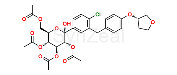 Empagliflozin Impurity 75 is chemically (2S,3R,4S,5R,6R)-6-(acetoxymethyl)-2-(4-chloro-3-(4-(((S)-tetrahydrofuran-3-yl)oxy)benzyl)phenyl)-2-hydroxytetrahydro-2H-pyran-3,4,5-triyl triacetate. Empagliflozin Impurity 75 is supplied with detailed characterization data compliant with regulatory guideline. Empagliflozin Impurity 75 can be used for the analytical method development, method validation (AMV), Quality Controlled (QC) application for Abbreviated New Drug Application (ANDA) or during commercial production of Empagliflozin.
