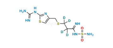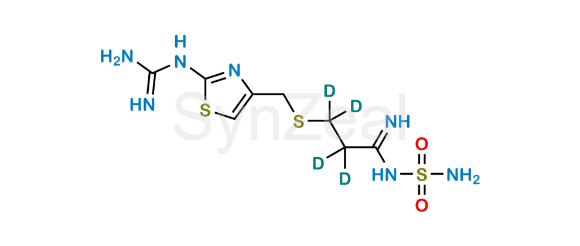 Famotidine D4 is chemically 3-(((2-Guanidinothiazol-4-yl)methyl)thio)-N-sulfamoylpropanimidamide. Famotidine D4 is supplied with detailed characterization data compliant with regulatory guideline. Famotidine D4 can be used for the analytical method development, method validation (AMV), Quality Controlled (QC) application for Abbreviated New Drug Application (ANDA) or during commercial production of Famotidine.