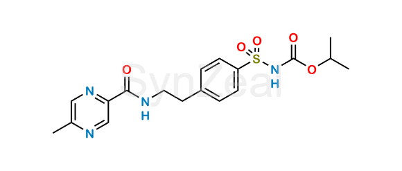 Glipizide Impurity 4 is chemically Isopropyl ((4-(2-(5-methylpyrazine-2-carboxamido)ethyl)phenyl)sulfonyl)carbamate. Glipizide Impurity 4 is supplied with detailed characterization data compliant with regulatory guideline. Glipizide Impurity 4 can be used for the analytical method development, method validation (AMV), Quality Controlled (QC) application for Abbreviated New Drug Application (ANDA) or during commercial production of Glipizide.