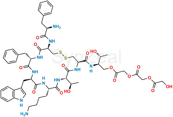 GlycoGlycoGlycolid Adduct of Octreotide is chemically 2-(2-((2R,3R)-2-((4R,7S,10S,13R,16S,19R)-13-((1H-indol-3-yl)methyl)-19-((R)-2-amino-3-phenylpropanamido)-10-(4-aminobutyl)-16-benzyl-7-((R)-1-hydroxyethyl)-6,9,12,15,18-pentaoxo-1,2-dithia-5,8,11,14,17-pentaazacycloicosane-4-carboxamido)-3-hydroxybutoxy)-2-oxoethoxy)-2-oxoethyl 2-hydroxyacetate. GlycoGlycoGlycolid Adduct of Octreotide is supplied with detailed characterization data compliant with regulatory guideline. GlycoGlycoGlycolid Adduct of Octreotide can be used for the analytical method development, method validation (AMV), Quality Controlled (QC) application for Abbreviated New Drug Application (ANDA) or during commercial production of Octreotide.