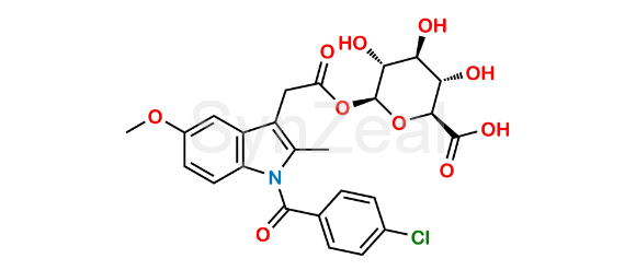 Indomethacin Acyl Glucuronide is chemically (2S,3S,4S,5R,6S)-6-(2-(1-(4-chlorobenzoyl)-5-methoxy-2-methyl-1H-indol-3-yl)acetoxy)-3,4,5-trihydroxytetrahydro-2H-pyran-2-carboxylic acid. Indomethacin Acyl Glucuronide is supplied with detailed characterization data compliant with regulatory guideline. Indomethacin Acyl Glucuronide can be used for the analytical method development, method validation (AMV), Quality Controlled (QC) application for Abbreviated New Drug Application (ANDA) or during commercial production of Indomethacin.