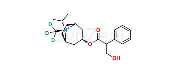 Ipratropium D3 is chemically (1R,3r,5S,8r)-3-((3-hydroxy-2-phenylpropanoyl)oxy)-8-isopropyl-8-(methyl-d3)-8-azabicyclo[3.2.1]octan-8-ium. Ipratropium D3 is supplied with detailed characterization data compliant with regulatory guideline. Ipratropium D3 can be used for the analytical method development, method validation (AMV), Quality Controlled (QC) application for Abbreviated New Drug Application (ANDA) or during commercial production of Ipratropium.