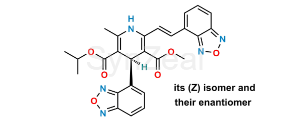 Nome Químico: Mixture of 3-methyl 5-(propan-2-yl) (4RS)-4-(2,1,3-benzoxadiazol-4-yl)-2-[(1EZ)-2-(2,1,3-benzoxadiazol-4-yl)ethen-1-yl]-6-methyl-1,4-dihydropyridine-3,5-dicarboxylate and 5-methyl 3-(propan-2-yl) (4RS)-4-(2,1,3-benzoxadiazol-4-yl)-2-[(1EZ)-2-(2,1,3-benzoxadiazol-4-yl)ethen-1-yl]-6-methyl-1,4-dihydropyridine-3,5-dicarboxylate (as per EP)