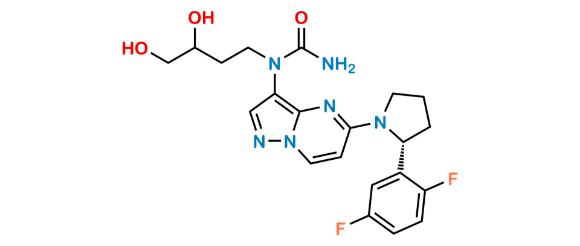 Larotrectinib Aminodiol Impurity is chemically 1-(5-((R)-2-(2,5-difluorophenyl)pyrrolidin-1-yl)pyrazolo[1,5-a]pyrimidin-3-yl)-1-(3,4-dihydroxybutyl)urea. Larotrectinib Aminodiol Impurity is supplied with detailed characterization data compliant with regulatory guideline. Larotrectinib Aminodiol Impurity can be used for the analytical method development, method validation (AMV), Quality Controlled (QC) application for Abbreviated New Drug Application (ANDA) or during commercial production of Larotrectinib.