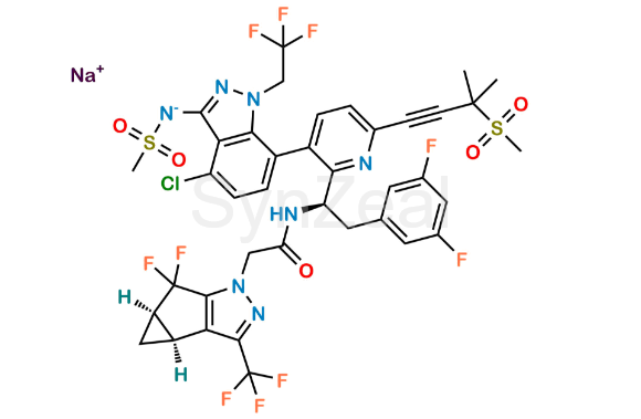 Nome Químico: sodium (4-chloro-7-(2-((R)-1-(2-((3bS,4aR)-5,5-difluoro-3-(trifluoromethyl)-3b,4,4a,5-tetrahydro-1H-cyclopropa[3,4]cyclopenta[1,2-c]pyrazol-1-yl)acetamido)-2-(3,5-difluorophenyl)ethyl)-6-(3-methyl-3-(methylsulfonyl)but-1-yn-1-yl)pyridin-3-yl)-1-(2,2,2-trifluoroethyl)-1H-indazol-3-yl)(methylsulfonyl)amide