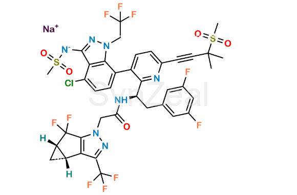 Nome Químico: Sodium (4-chloro-7-(2-((R)-1-(2-((3bR,4aS)-5,5-difluoro-3-(trifluoromethyl)-3b,4,4a,5-tetrahydro-1H-cyclopropa[3,4]cyclopenta[1,2-c]pyrazol-1-yl)acetamido)-2-(3,5-difluorophenyl)ethyl)-6-(3-methyl-3-(methylsulfonyl)but-1-yn-1-yl)pyridin-3-yl)-1-(2,2,2-trifluoroethyl)-1H-indazol-3-yl)(methylsulfonyl)amide