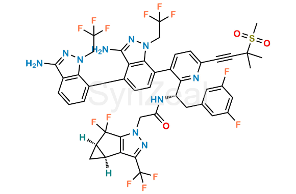Nome Químico: N-((S)-1-(3-(3,3'-diamino-1,1'-bis(2,2,2-trifluoroethyl)-1H,1'H-[4,7'-biindazol]-7-yl)-6-(3-methyl-3-(methylsulfonyl)but-1-yn-1-yl)pyridin-2-yl)-2-(3,5-difluorophenyl)ethyl)-2-((3bS,4aR)-5,5-difluoro-3-(trifluoromethyl)-3b,4,4a,5-tetrahydro-1H-cyclopropa[3,4]cyclopenta[1,2-c]pyrazol-1-yl)acetamide