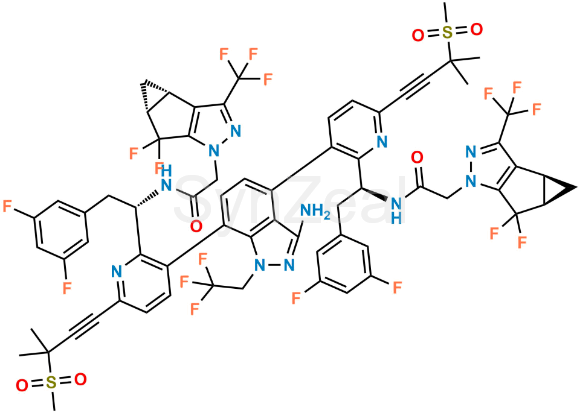 Nome Químico: N,N'-((1S,1'S)-((3-amino-1-(2,2,2-trifluoroethyl)-1H-indazole-4,7-diyl)bis(6-(3-methyl-3-(methylsulfonyl)but-1-yn-1-yl)pyridine-3,2-diyl))bis(2-(3,5-difluorophenyl)ethane-1,1-diyl))bis(2-((3bS,4aR)-5,5-difluoro-3-(trifluoromethyl)-3b,4,4a,5-tetrahydro-1H-cyclopropa[3,4]cyclopenta[1,2-c]pyrazol-1-yl)acetamide)