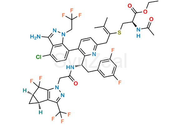 Nome Químico: Ethyl N-acetyl-S-(1-(5-(3-amino-4-chloro-1-(2,2,2-trifluoroethyl)-1H-indazol-7-yl)-6-((S)-1-(2-((3bS,4aR)-5,5-difluoro-3-(trifluoromethyl)-3b,4,4a,5-tetrahydro-1H-cyclopropa[3,4]cyclopenta[1,2-c]pyrazol-1-yl)acetamido)-2-(3,5-difluorophenyl)ethyl)pyridin-2-yl)-3-methylbut-2-en-2-yl)-L-cysteinate