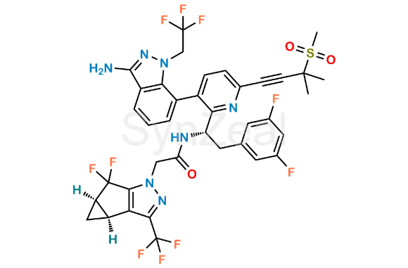 Nome Químico: N-((S)-1-(3-(3-amino-1-(2,2,2-trifluoroethyl)-1H-indazol-7-yl)-6-(3-methyl-3-(methylsulfonyl)but-1-yn-1-yl)pyridin-2-yl)-2-(3,5-difluorophenyl)ethyl)-2-((3bS,4aR)-5,5-difluoro-3-(trifluoromethyl)-3b,4,4a,5-tetrahydro-1H-cyclopropa[3,4]cyclopenta[1,2-c]pyrazol-1-yl)acetamide