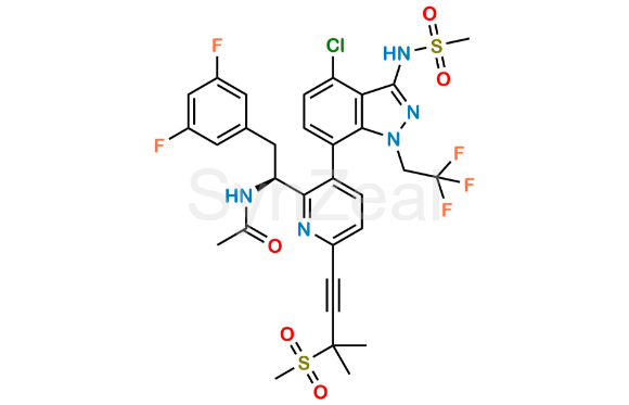 Nome Químico: (S)-N-(1-(3-(4-chloro-3-(methylsulfonamido)-1-(2,2,2-trifluoroethyl)-1H-indazol-7-yl)-6-(3-methyl-3-(methylsulfonyl)but-1-yn-1-yl)pyridin-2-yl)-2-(3,5-difluorophenyl)ethyl)acetamide
