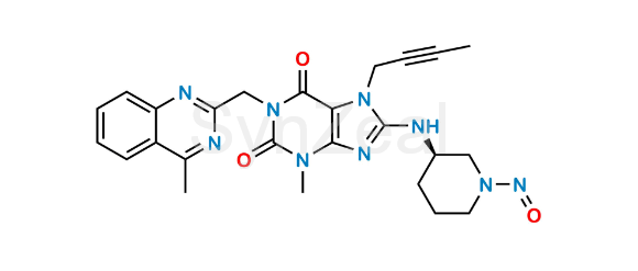 Linagliptin Regio Isomer Nitroso Impurity 1 is chemically (R)-7-(but-2-yn-1-yl)-3-methyl-1-((4-methylquinazolin-2-yl)methyl)-8-((1-nitrosopiperidin-3-yl)amino)-3,7-dihydro-1H-purine-2,6-dione. Linagliptin Regio Isomer Nitroso Impurity 1 is supplied with detailed characterization data compliant with regulatory guideline. Linagliptin Regio Isomer Nitroso Impurity 1 can be used for the analytical method development, method validation (AMV), Quality Controlled (QC) application for Abbreviated New Drug Application (ANDA) or during commercial production of Linagliptin.