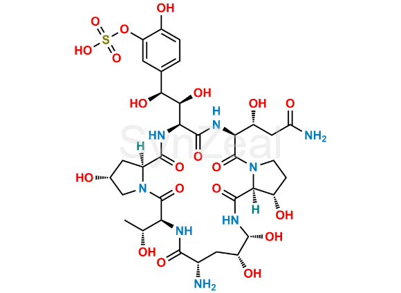 Nome Químico: 5-((1S,2S)-2-((2R,6S,9S,11R,12R,14aS,15S,20S,23S,25aS)-9-amino-20-((R)-3-amino-1-hydroxy-3-oxopropyl)-2,11,12,15-tetrahydroxy-6-((R)-1-hydroxyethyl)-5,8,14,19,22,25-hexaoxotetracosahydro-1H-dipyrrolo[2,1-c:2',1'-l][1,4,7,10,13,16]hexaazacyclohenicosin-23-yl)-1,2-dihydroxyethyl)-2-hydroxyphenyl hydrogen sulfate