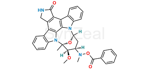 Midostaurin Impurity D is chemically (5S,6R,7R,9R)-7-((benzoyloxy)(methyl)amino)-6-methoxy-5-methyl-6,7,8,9,15,16-hexahydro-5H,14H-17-oxa-4b,9a,15-triaza-5,9-methanodibenzo[b,h]cyclonona[jkl]cyclopenta[e]-as-indacen-14-one. It is also known as Midostaurin N-Benzoyloxy impurity. Midostaurin Impurity D is supplied with detailed characterization data compliant with regulatory guideline. Midostaurin Impurity D can be used for the analytical method development, method validation (AMV), Quality Controlled (QC) application for Abbreviated New Drug Application (ANDA) or during commercial production of Midostaurin.