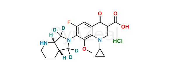 Moxifloxacin D4 Hydrochloride is chemically 1-cyclopropyl-6-fluoro-8-methoxy-7-((4aS,7aS)-octahydro-6H-pyrrolo[3,4-b]pyridin-6-yl-5,5,7,7-d4)-4-oxo-1,4-dihydroquinoline-3-carboxylic acid hydrochloride. Moxifloxacin D4 Hydrochloride is supplied with detailed characterization data compliant with regulatory guideline. Moxifloxacin D4 Hydrochloride can be used for the analytical method development, method validation (AMV), Quality Controlled (QC) application for Abbreviated New Drug Application (ANDA) or during commercial production of Moxifloxacin.