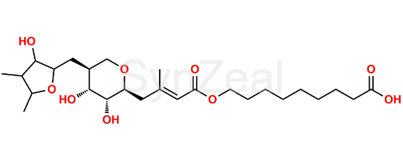 Mupirocin USP impurity 4 (RRT 1.36) is chemically 9-(((E)-4-((2S,3R,4R,5S)-3,4-dihydroxy-5-((3-hydroxy-4,5-dimethyltetrahydrofuran-2-yl)methyl)tetrahydro-2H-pyran-2-yl)-3-methylbut-2-enoyl)oxy)nonanoic acid. Mupirocin USP impurity 4 (RRT 1.36) is supplied with detailed characterization data compliant with regulatory guideline. Mupirocin USP impurity 4 (RRT 1.36) can be used for the analytical method development, method validation (AMV), Quality Controlled (QC) application for Abbreviated New Drug Application (ANDA) or during commercial production of Mupirocin.