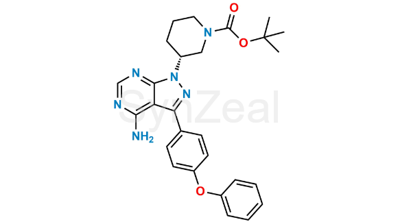N-Boc-Ibrutinib is chemically Tert-butyl (R)-3-(4-amino-3-(4-phenoxyphenyl)-1H-pyrazolo[3,4-d]pyrimidin-1-yl)piperidine-1-carboxylate. It is also known as tert-Butyl-1-carboxyl Piperidine analog of Ibrutinib. N-Boc-Ibrutinib is supplied with detailed characterization data compliant with regulatory guideline. N-Boc-Ibrutinib can be used for the analytical method development, method validation (AMV), Quality Controlled (QC) application for Abbreviated New Drug Application (ANDA) or during commercial production of Ibrutinib.