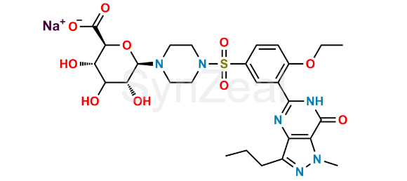 N-Desmethyl Sildenafil-N-β-D-Glucuronide is chemically Sodium (2S,3S,5R,6R)-6-(4-((4-ethoxy-3-(1-methyl-7-oxo-3-propyl-6,7-dihydro-1H-pyrazolo[4,3-d]pyrimidin-5-yl)phenyl)sulfonyl)piperazin-1-yl)-3,4,5-trihydroxytetrahydro-2H-pyran-2-carboxylate. N-Desmethyl Sildenafil-N-β-D-Glucuronide is supplied with detailed characterization data compliant with regulatory guideline. N-Desmethyl Sildenafil-N-β-D-Glucuronide can be used for the analytical method development, method validation (AMV), Quality Controlled (QC) application for Abbreviated New Drug Application (ANDA) or during commercial production of Sildenafil .