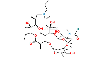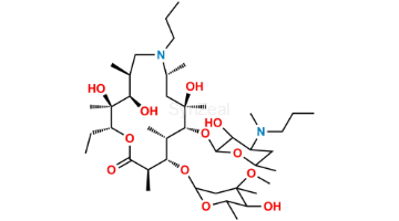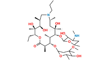 N-Despropyl Gamithromycin 10,13-Imino Ether is chemically (3R,5R,6R,7S,8S,9R,12R,13S,14R,15R,Z)-6-(((2S,3R,4S,6R)-4-(dimethylamino)-3-hydroxy-6-methyltetrahydro-2H-pyran-2-yl)oxy)-12-ethyl-5,14-dihydroxy-8-(((2R,4R,5S,6S)-5-hydroxy-4-methoxy-4,6-dimethyltetrahydro-2H-pyran-2-yl)oxy)-3,5,7,9,13,15-hexamethyl-11,16-dioxa-2-azabicyclo[11.2.1]hexadec-1-en-10-one. N-Despropyl Gamithromycin 10,13-Imino Ether is supplied with detailed characterization data compliant with regulatory guideline. N-Despropyl Gamithromycin 10,13-Imino Ether can be used for the analytical method development, method validation (AMV), Quality Controlled (QC) application for Abbreviated New Drug Application (ANDA) or during commercial production of Gamithromycin.