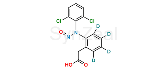 N-Nitroso Diclofenac D4 is chemically 2-(2-((2,6-Dichlorophenyl)(nitroso)amino)phenyl-3,4,5,6-d4)acetic acid. N-Nitroso Diclofenac D4 is supplied with detailed characterization data compliant with regulatory guideline. N-Nitroso Diclofenac D4 can be used for the analytical method development, method validation (AMV), Quality Controlled (QC) application for Abbreviated New Drug Application (ANDA) or during commercial production of Diclofenac.