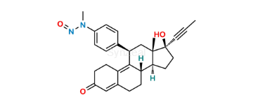 N-Nitroso N-Desmethyl Mifepristone is chemically N-(4-((8S,11R,13S,14S,17S)-17-Hydroxy-13-methyl-3-oxo-17-(prop-1-yn-1-yl)-2,3,6,7,8,11,12,13,14,15,16,17-dodecahydro-1H-cyclopenta[a]phenanthren-11-yl)phenyl)-N-methylnitrous amide. N-Nitroso N-Desmethyl Mifepristone is supplied with detailed characterization data compliant with regulatory guideline. N-Nitroso N-Desmethyl Mifepristone can be used for the analytical method development, method validation (AMV), Quality Controlled (QC) application for Abbreviated New Drug Application (ANDA) or during commercial production of Mifepristone.