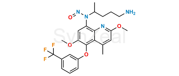 N-Nitroso Tafenoquine is chemically N-(5-aminopentan-2-yl)-N-(2,6-dimethoxy-4-methyl-5-(3-(trifluoromethyl)phenoxy)quinolin-8-yl)nitrous amide. N-Nitroso Tafenoquine is supplied with detailed characterization data compliant with regulatory guideline. N-Nitroso Tafenoquine can be used for the analytical method development, method validation (AMV), Quality Controlled (QC) application for Abbreviated New Drug Application (ANDA) or during commercial production of Tafenoquine.