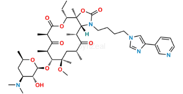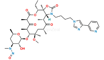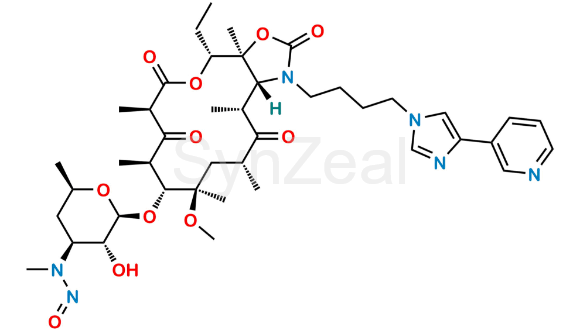 N-Nitroso Telithromycin is chemically N-((2S,3R,4S,6R)-2-(((3aS,4R,7R,9R,10R,11R,13R,15R,15aR)-4-ethyl-11-methoxy-3a,7,9,11,13,15-hexamethyl-2,6,8,14-tetraoxo-1-(4-(4-(pyridin-3-yl)-1H-imidazol-1-yl)butyl)tetradecahydro-2H-[1]oxacyclotetradecino[4,3-d]oxazol-10-yl)oxy)-3-hydroxy-6-methyltetrahydro-2H-pyran-4-yl)-N-methylnitrous amide. N-Nitroso Telithromycin is supplied with detailed characterization data compliant with regulatory guideline. N-Nitroso Telithromycin can be used for the analytical method development, method validation (AMV), Quality Controlled (QC) application for Abbreviated New Drug Application (ANDA) or during commercial production of Telithromycin.