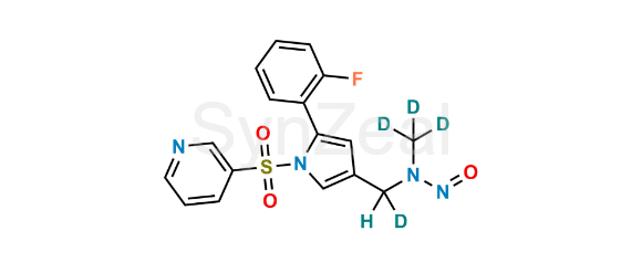 N-Nitroso Vonoprazan-D4 is chemically N-((5-(2-Fluorophenyl)-1-(pyridin-3-ylsulfonyl)-1H-pyrrol-3-yl)methyl-d)-N-(methyl-d3)nitrous amide. N-Nitroso Vonoprazan-D4 is supplied with detailed characterization data compliant with regulatory guideline. N-Nitroso Vonoprazan-D4 can be used for the analytical method development, method validation (AMV), Quality Controlled (QC) application for Abbreviated New Drug Application (ANDA) or during commercial production of Vonoprazan.