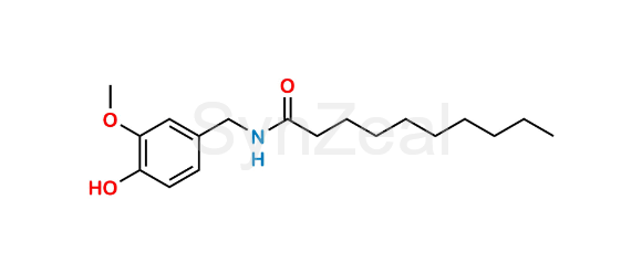 N-Vanillyl Decanamide is chemically N-(4-hydroxy-3-methoxybenzyl)decanamide. N-Vanillyl Decanamide is supplied with detailed characterization data compliant with regulatory guideline. N-Vanillyl Decanamide can be used for the analytical method development, method validation (AMV), Quality Controlled (QC) application for Abbreviated New Drug Application (ANDA) or during commercial production of Capsaicin.