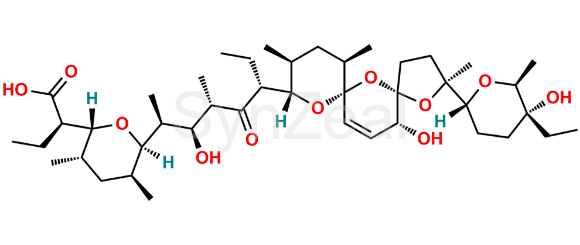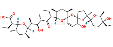 Nome Químico: (R)-2-((2R,3S,5S,6R)-6-((2S,3S,4S,6R)-6-((2S,5S,7R,9S,10S,12R,15R)-2-((2R,5R,6S)-5-ethyl-5-hydroxy-6-methyltetrahydro-2H-pyran-2-yl)-15-hydroxy-2,10,12-trimethyl-1,6,8-trioxadispiro[4.1.57.35]pentadec-13-en-9-yl)-3-hydroxy-4-methyl-5-oxooctan-2-yl)-3,5-dimethyltetrahydro-2H-pyran-2-yl)butanoic acid
