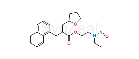 Nitrosamines Impurity 5 is chemically 2-(Ethyl(nitroso)amino)ethyl 3-(naphthalen-1-yl)-2-((tetrahydrofuran-2-yl)methyl)propanoate. Nitrosamines Impurity 5 is supplied with detailed characterization data compliant with regulatory guideline. Nitrosamines Impurity 5 can be used for the analytical method development, method validation (AMV), Quality Controlled (QC) application for Abbreviated New Drug Application (ANDA) or during commercial production of Nitrosamines.