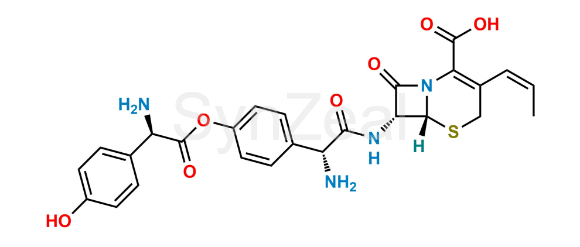 Nome Químico: (6R,7R)-7-[(R)-2-Amino-2-{4-[(R)-2-amino-2-(4-hydroxyphenyl)acetoxy]phenyl}acetamido]-8-oxo-3-[(Z)-prop-1-enyl]-5-thia-1-azabicyclo[4.2.0]oct-2-ene-2-carboxylic acid (as per USP)