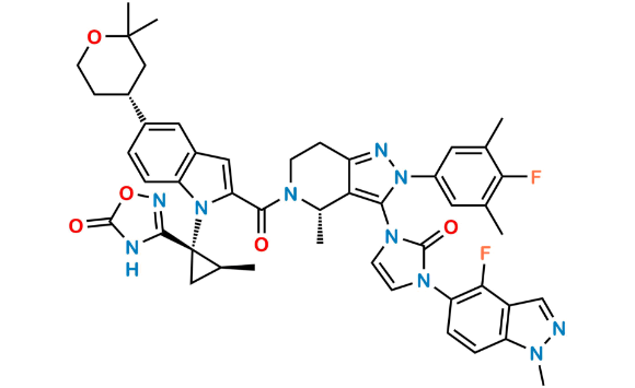 Nome Químico: 3-((1S,2S)-1-(5-((R)-2,2-dimethyltetrahydro-2H-pyran-4-yl)-2-((S)-3-(3-(4-fluoro-1-methyl-1H-indazol-5-yl)-2-oxo-2,3-dihydro-1H-imidazol-1-yl)-2-(4-fluoro-3,5-dimethylphenyl)-4-methyl-4,5,6,7-tetrahydro-2H-pyrazolo[4,3-c]pyridine-5-carbonyl)-1H-indol-1-yl)-2-methylcyclopropyl)-1,2,4-oxadiazol-5(4H)-one