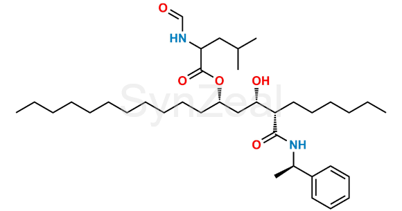 Orlistat Open Ring Amide is chemically (S)-(7S,8S,10S)-8-hydroxy-7-(((R)-1-phenylethyl)carbamoyl)henicosan-10-yl 2-formamido-4-methylpentanoate. It is also known as Orlistat Open Ring (2S,3S,5S)-Isomer. Orlistat Open Ring Amide is supplied with detailed characterization data compliant with regulatory guideline. Orlistat Open Ring Amide can be used for the analytical method development, method validation (AMV), Quality Controlled (QC) application for Abbreviated New Drug Application (ANDA) or during commercial production of Orlistat .