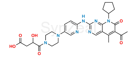 Palbociclib Malic Acid Adduct is chemically 4-(4-(6-((6-acetyl-8-cyclopentyl-5-methyl-7-oxo-7,8-dihydropyrido[2,3-d]pyrimidin-2-yl)amino)pyridin-3-yl)piperazin-1-yl)-3-hydroxy-4-oxobutanoic acid. Palbociclib Malic Acid Adduct is supplied with detailed characterization data compliant with regulatory guideline. Palbociclib Malic Acid Adduct can be used for the analytical method development, method validation (AMV), Quality Controlled (QC) application for Abbreviated New Drug Application (ANDA) or during commercial production of Palbociclib.