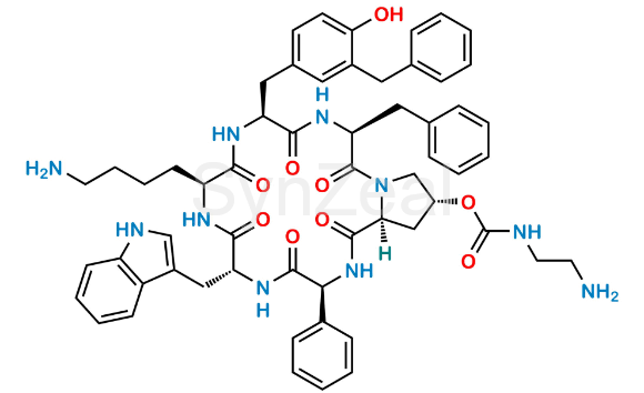 Nome Químico: (3S,6R,9S,12S,15S,19R,20aS)-6-((1H-indol-3-yl)methyl)-9-(4-aminobutyl)-15-benzyl-12-(3-benzyl-4-hydroxybenzyl)-1,4,7,10,13,16-hexaoxo-3-phenylicosahydropyrrolo[1,2-a][1,4,7,10,13,16]hexaazacyclooctadecin-19-yl (2-aminoethyl)carbamate