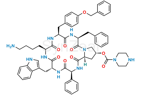 Nome Químico: (3S,6R,9S,12S,15S,19R,20aS)-6-((1H-indol-3-yl)methyl)-9-(4-aminobutyl)-15-benzyl-12-(4-(benzyloxy)benzyl)-1,4,7,10,13,16-hexaoxo-3-phenylicosahydropyrrolo[1,2-a][1,4,7,10,13,16]hexaazacyclooctadecin-19-yl piperazine-1-carboxylate