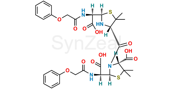Penicillin Dimer Impurity 1 is chemically (2S,4R)-2-((S)-carboxy(2-phenoxyacetamido)methyl)-3-((2R,4S)-2-((R)-carboxy(2-phenoxyacetamido)methyl)-5,5-dimethylthiazolidine-4-carbonyl)-5,5-dimethylthiazolidine-4-carboxylic acid. Penicillin Dimer Impurity 1 is supplied with detailed characterization data compliant with regulatory guideline. Penicillin Dimer Impurity 1 can be used for the analytical method development, method validation (AMV), Quality Controlled (QC) application for Abbreviated New Drug Application (ANDA) or during commercial production of Penicillin.